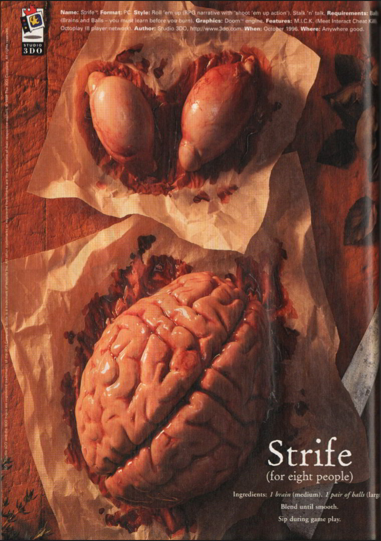 Strife used the Doom engine but had talking bits as well. So, er, brains as well as, um, balls? Which sort of makes sense, in a way. But then you see the weird suggestion in the bottom corner that you should take these raw ingredients, blend them together, and consume them while playing.