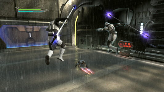 Puzzles and other subtleties are limited to a repeated requirement to use the Force to manoeuvre batteries into door panels in order to open them, and the dotting of power-ups in slightly odd places, inviting you to consider whether a specific combination of difficult moves and jumps could get you there and if that effort would be worth it. As before, combinations of various lightsaber crystals benefit you in different ways, and you can choose to beef up various Force powers as you progress. New powers include Mind Trick, which I mistakenly thought was featured in the first game (turns out it was Jedi Knight II that I was thinking of) and Force Rage, which is a kind of turbo-nutter-ninja mode best employed when you’re completely overwhelmed and can’t be bothered approaching things too tactically.