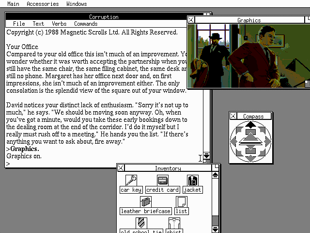 For those of a wimpier disposition, it’s probably worth noting that Corruption was later re-released as part of The Magnetic Scrolls Collection, which uses a graphical interface known as ‘Magnetic Windows’, first used in a later game called Wonderland. If you want to dodge some of the idiosyncrasies of the original, then this is probably the version to check out; although the content remains pretty much the same, the interface gives you access to a map, an inventory and details of the objects in the room without you having to use up any time.