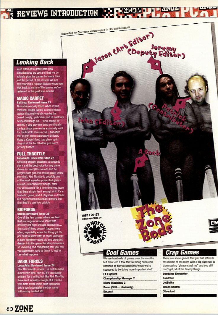 Onto the games, and the reviews section remained much the same as before, although the decision to superimpose the reviewers’ heads onto a Red Hot Chilli Peppers ‘socks on cocks’ picture is surely an image that took many a Zone reader some time and effort to scrub from their memory. Disturbing imagery aside, the reviews intro during this period also featured a brief ‘Looking Back’ section, in which reviewers either added further praise to, or back-pedalled away from, their original verdicts.