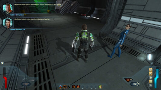 Elsewhere, it’s a mish-mash of influences. Seth could almost be Mass Effect‘s default male Shepard, although to be fair, generic gritty sci-fi space soldier blokes do all tend to look alike. Some of the references could be considered paying homage to established sci-fi staples, if you were feeling generous, although it does seem fairly obvious even to me as someone who hasn’t played much of either of the System Shocks, that the story owes plenty – and perhaps more than it should – to those games. Datapads lying around fill in some backstory, some of which is mildly interesting, but it’s all very lightweight.